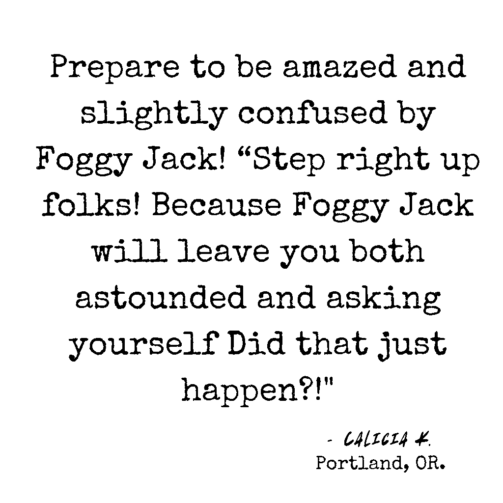 Foggy Jack is a professional magician with over 15+ years of experience (though his face refuses to show it). He’s traveled coast to coast, captivating thousands with his signature brand of Paranormal Mentalism—a blend of eerie intuition, haunted sleight of hand, and razor-sharp showmanship. From booming trade shows and bustling conventions to circus tents and actual haunted locations, Foggy Jack brings the supernatural to life with every step.